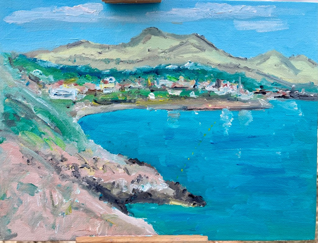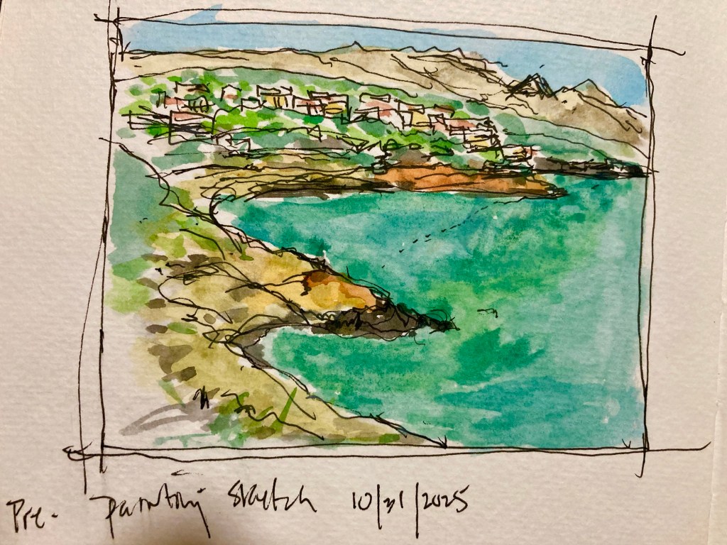 The light was low and partly cloudy and the route lacked elevation and elements to paint. I finally decided on this one area that offered a good hill and a good vista of the bays and distant hills.