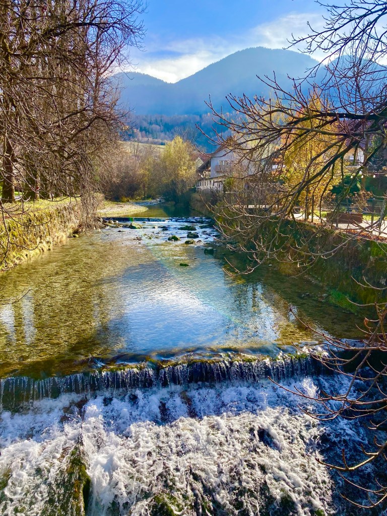 Another amazing day hiking and exploring from the town of Bohinjska Bistrica. It was cold and freezing temps but clear and very quiet and empty as I hiked a few miles up to a famous set of waterfalls out of town and up some steep mountains. I hiked for hours without seeing a single other person. One part of that trail was very steep and with the wet frosty leaves and the exposed roots, it made for a very slippery trail for a bit.